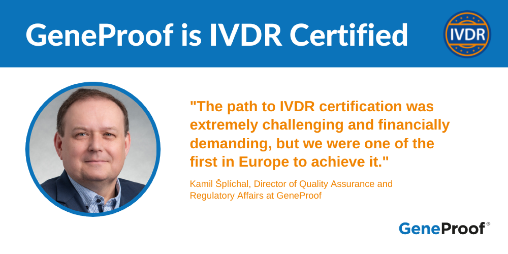 „Cesta k IVDR certifikátu byla nesmírně náročná a nákladná, ale my jsme to jako jedni z prvních v Evropě dokázali“, sděluje s potěšením a hrdostí ředitel pro kvalitu a regulační záležitosti společnosti GeneProof, Kamil Šplíchal. „S přípravami jsme začali asi před 5 lety a investovali prostředky v řádu několika desítek milionů korun. Pro výrobce in vitro diagnostických prostředků se jedná především přípravu rozsáhlé technické dokumentace, včetně klinických validací produktů. Nyní jsme tedy dosáhli jednoho ze zásadních milníků pro další úspěšné fungování naší společnosti na evropském i světovém trhu. Dáváme tak jasný signál našim obchodní partnerům, že jsme spolehlivým výrobcem in vitro diagnostik i do budoucna.“